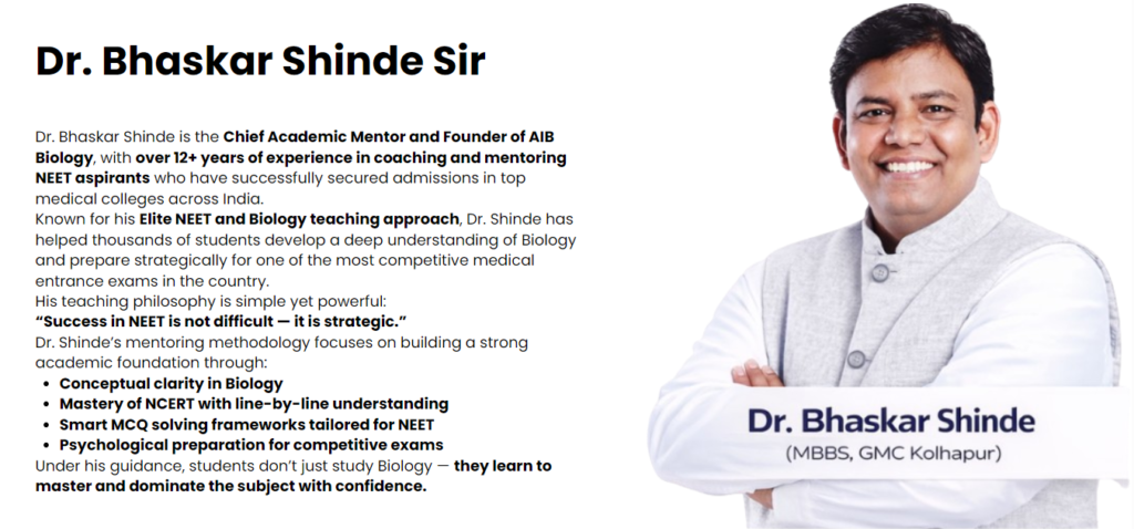 Dr. Bhaskar Shinde is the Chief Academic Mentor and Founder of AIB Biology, with over 12+ years of experience in coaching and mentoring NEET aspirants who have successfully secured admissions in top medical colleges across India.